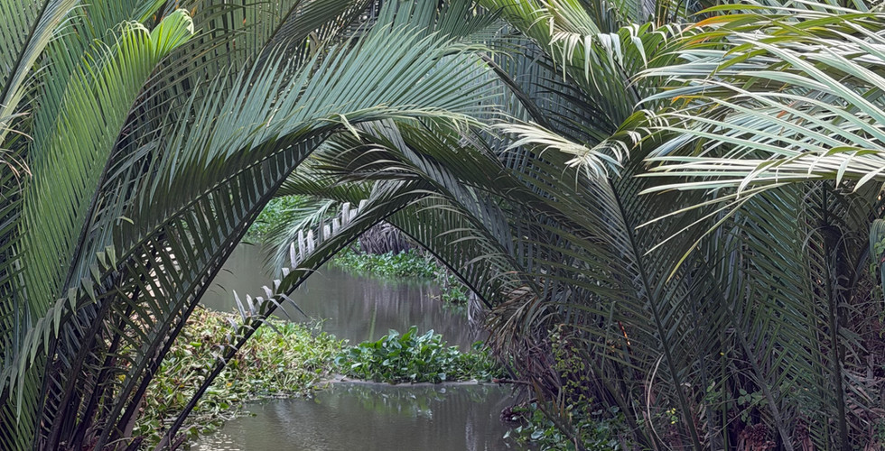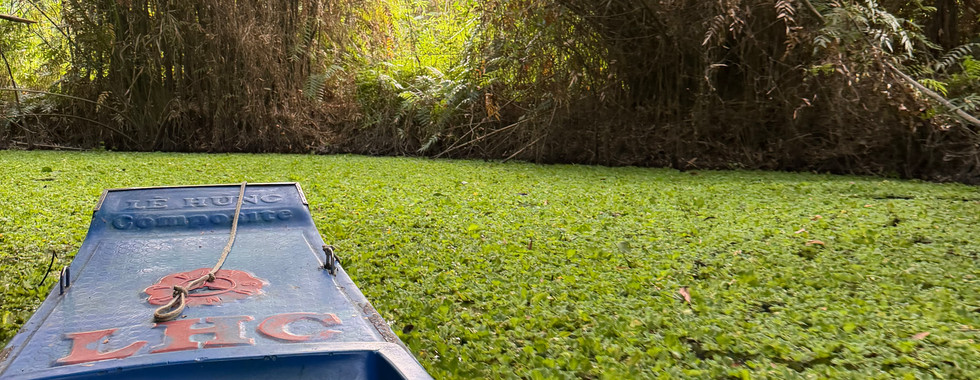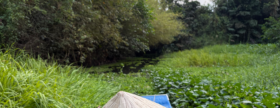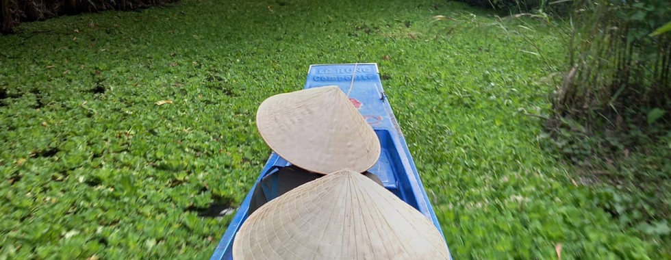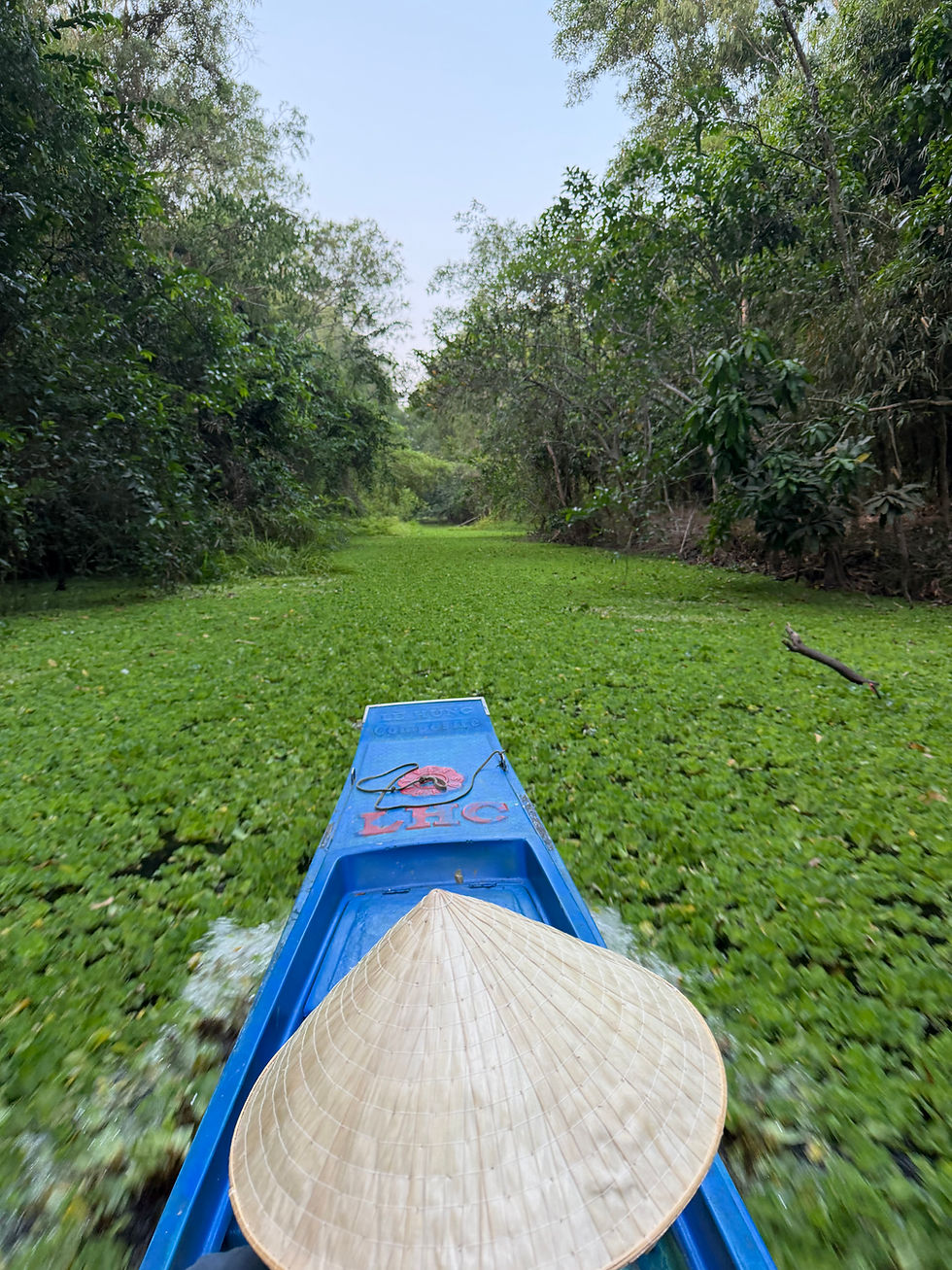 Now more on the boat. We sat on this small boat, being driven through the lush greenery in Mud Xuan Nature Reserve Park. It was absolutely stunning as she pointed out the flora we were driving by. She also presented us with these traditional cone hats, Non la, which, aside from looking like photo props, are actually extremely helpful in sun protection. Much better than my safari hat!
