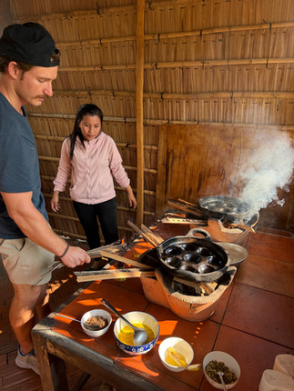 After passing through the infamous floating market during its 6am hustle and bustle, we slowed things down in the countryside. Finding ourselves in another remote area, we enjoyed conversation with our tour guide, Sophia, and our two friends, who we met from Ireland and England. We stopped at a homestay in the countryside where we participated in a mini cooking class with our group, cooking the savory Vietnamese pancakes. Often enjoyed at restaurants but saved for special events when being cooked at home.